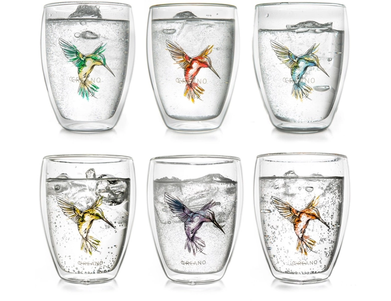 Setul de 6 pahare termo din sticla Creano Hummi aduce culoare, eleganta si functionalitate in ritualurile zilnice de ceai sau cafea. Fiecare pahar este decorat cu un motiv delicat de colibri (hummingbird), simbol al bucuriei si energiei, si este realizat din sticla borosilicata de inalta calitate.