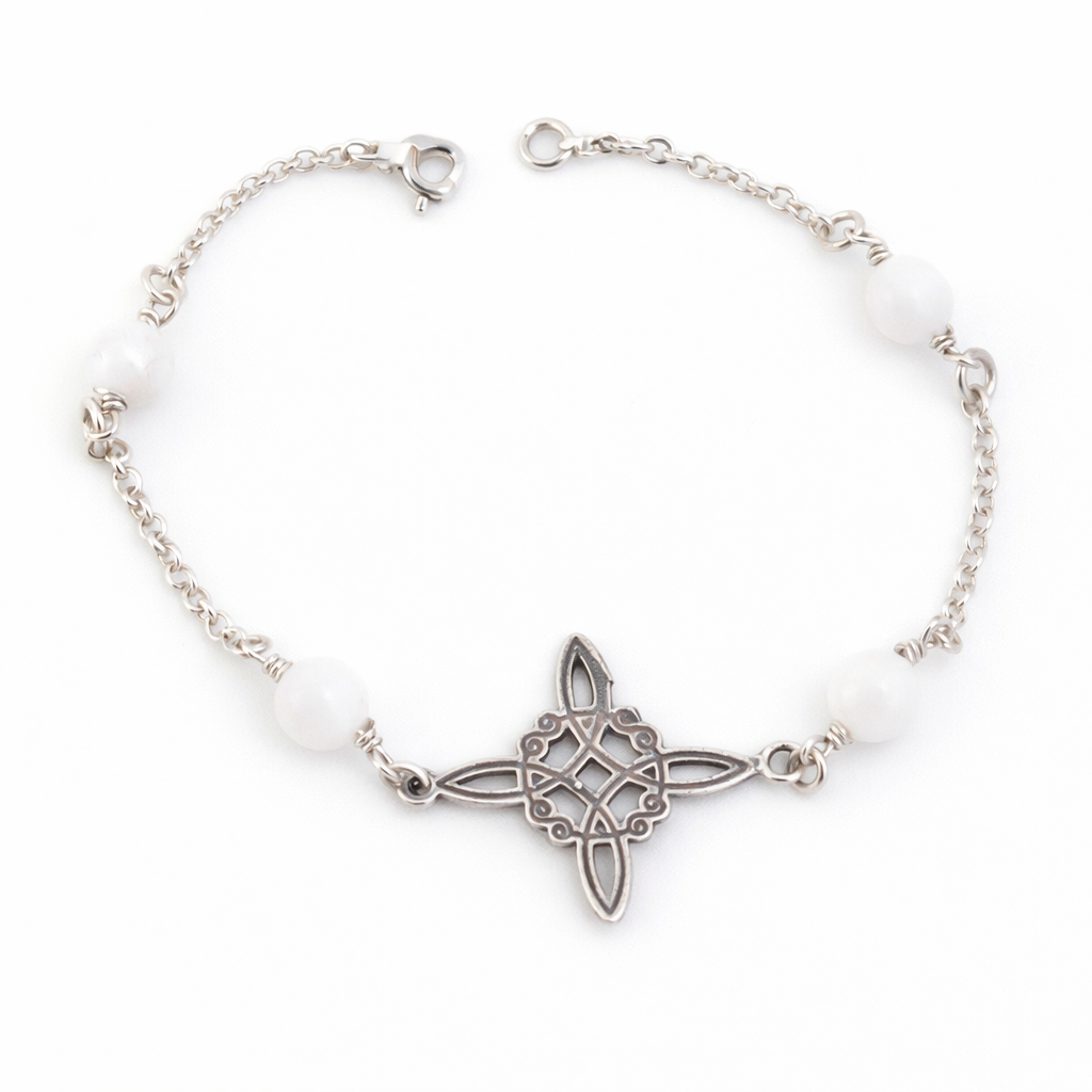 Bratara realizata din argint 925, decorata cu bile de piatra lunii naturala de 6 mm si element central Nodul Vrajitoarei cu diametrul de 22 mm. Produs fabricat in Spania.