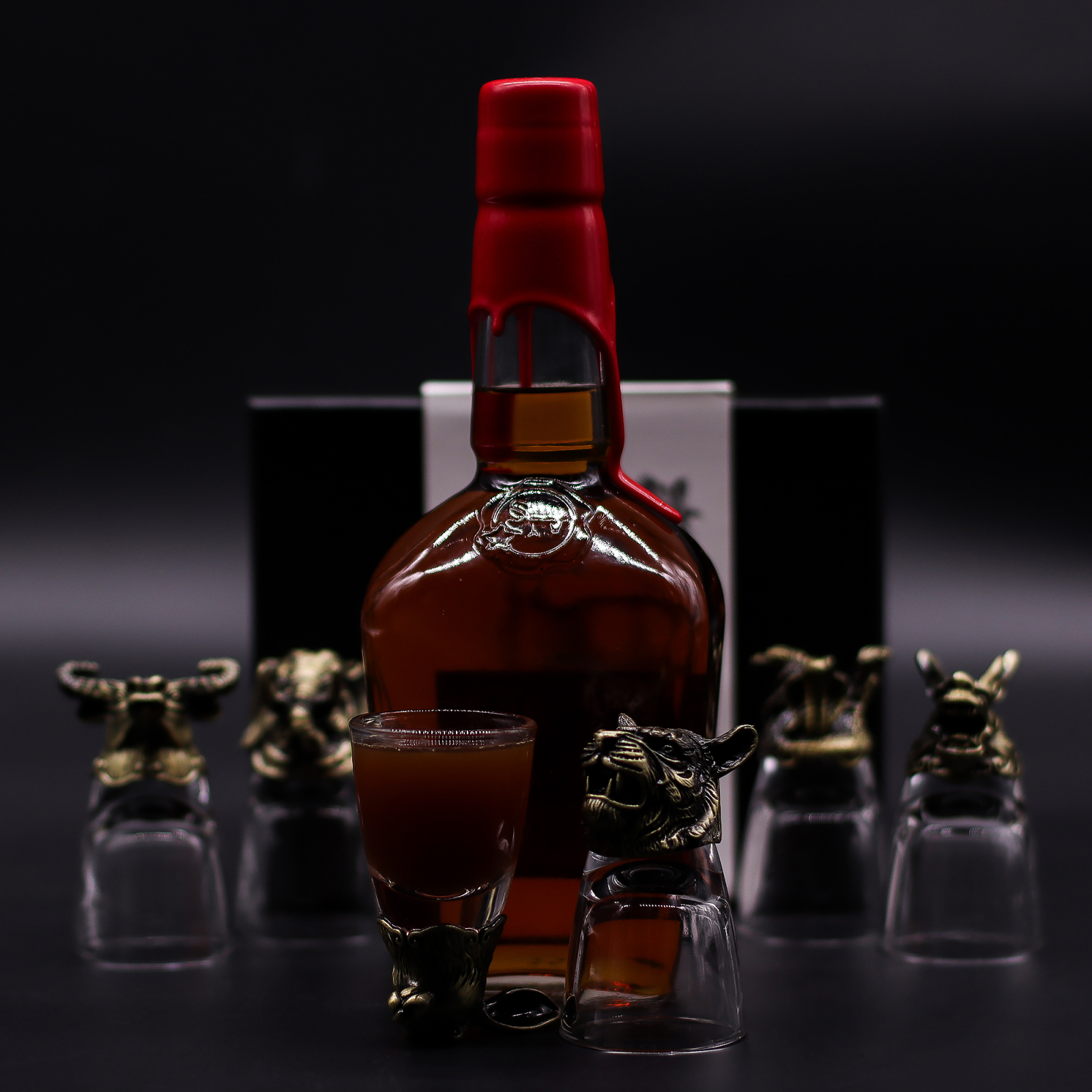 Acest set de 6 pahare de shot Bottom Up (50 ml) imbina eleganta sticlei clare cu forta simbolica a bazelor din alama, fiecare sculptata cu atentie in forma unei creaturi mitice: dragon, tigru, cobra, elefant, capra si berbec.