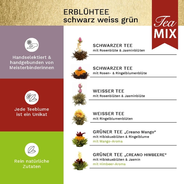 Ceai negru, ceai alb, ceai verde, flori de bujor, galbenele, trandafir, iasomie, flori de hibiscus, arome naturale.
