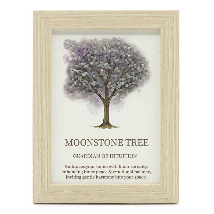 Piatra lunii este asociata in mod traditional cu intuitia, claritatea emotionala si echilibrul interior. Reflexiile sale discrete si nuantele reci adauga tabloului o prezenta calma si rafinata, potrivita pentru spatiile dedicate relaxarii, meditatiei sau odihnei.