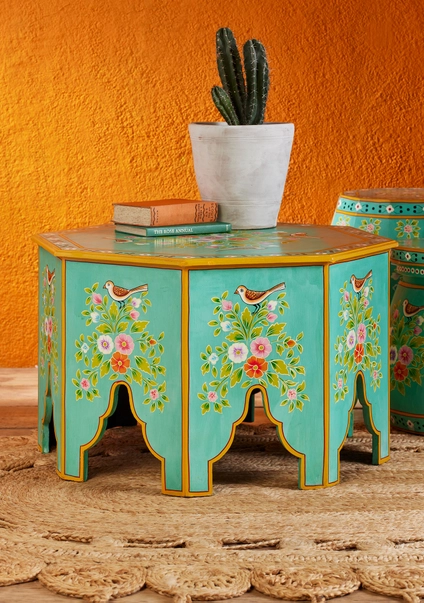 Inspirata din mestesugurile pline de culoare ale deserturilor Rajasthanului, masuta este realizata manual cu atentie la detalii de artizani specializati in mobilier pictat de inalta calitate.