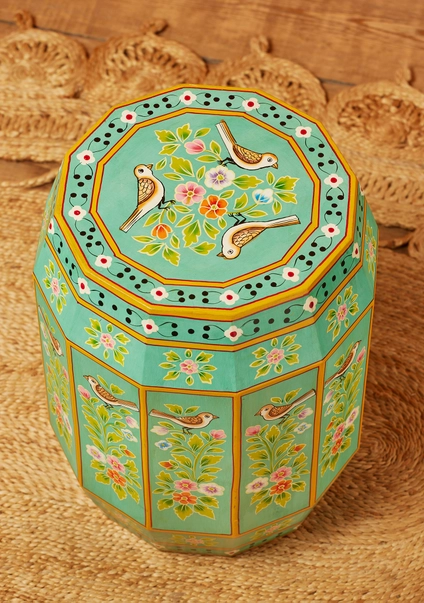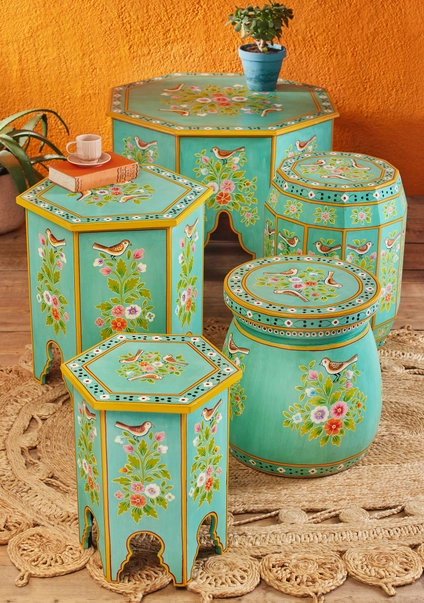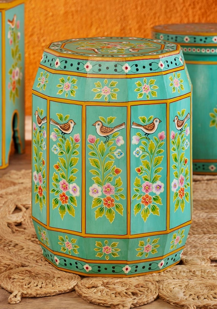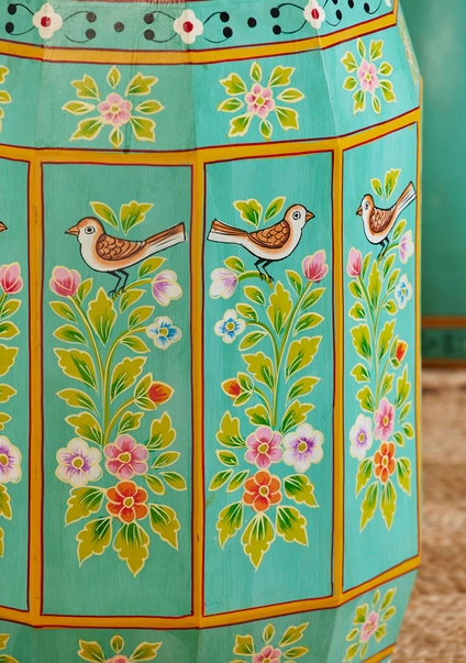 Masuta laterala sau taburetul Panchi impresioneaza prin designul sau unghiular si pictura manuala eleganta. Panourile laterale sunt decorate cu flori roz si pasari delicate asezate fata in fata, conturate cu benzi aurii si margini ornamentate cu flori albe.