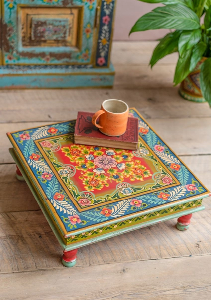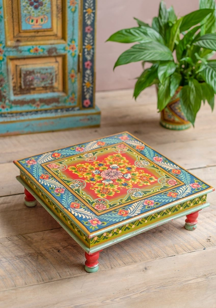 Masuta patrata de tip indian, joasa, traditionala, este cunoscuta sub numele de bajot si a fost folosita de-a lungul timpului la ritualuri, ceremonii si mese in familie. Decorata manual cu un model vibrant, aceasta piesa este compacta si versatila, ideala ca masuta laterala, suport decorativ sau piedestal pentru obiecte de accent.
