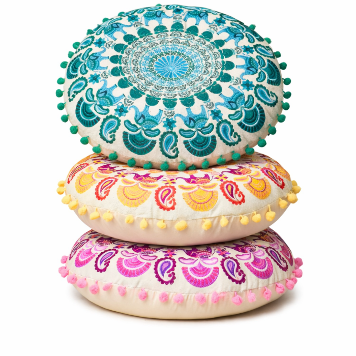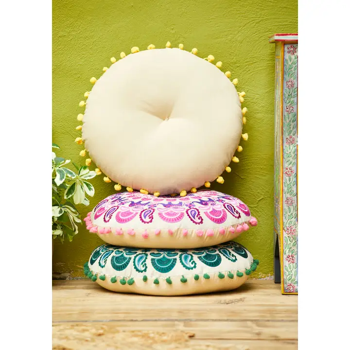 Perna Rotunda Brodata Mandala este o piesa decorativa plina de culoare si personalitate, ideala pentru a adauga un accent boem si confortabil in orice incapere. Disponibila in trei variante de culoare, mov, turcoaz si portocaliu, aceasta perna imbina estetica traditionala indiana cu functionalitatea moderna.