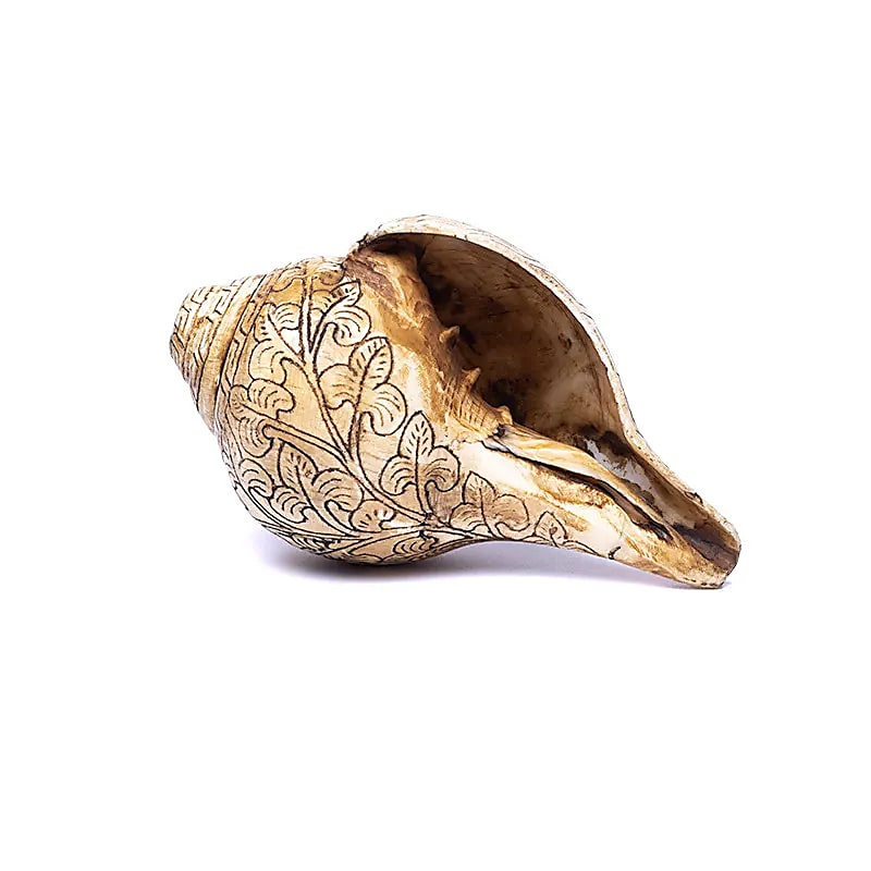 Aceasta scoica ritualica, cunoscuta sub denumirea de trompeta conch, este un obiect sacru cu radacini in traditii precum Budismul Tibetan, Hinduismul si Feng Shui. Gravata cu simbolul OMPMH – o varianta stilizata a mantrei „OM” – scoica devine nu doar un obiect natural de colectie, ci si un instrument spiritual cu puternica incarcatura simbolica.