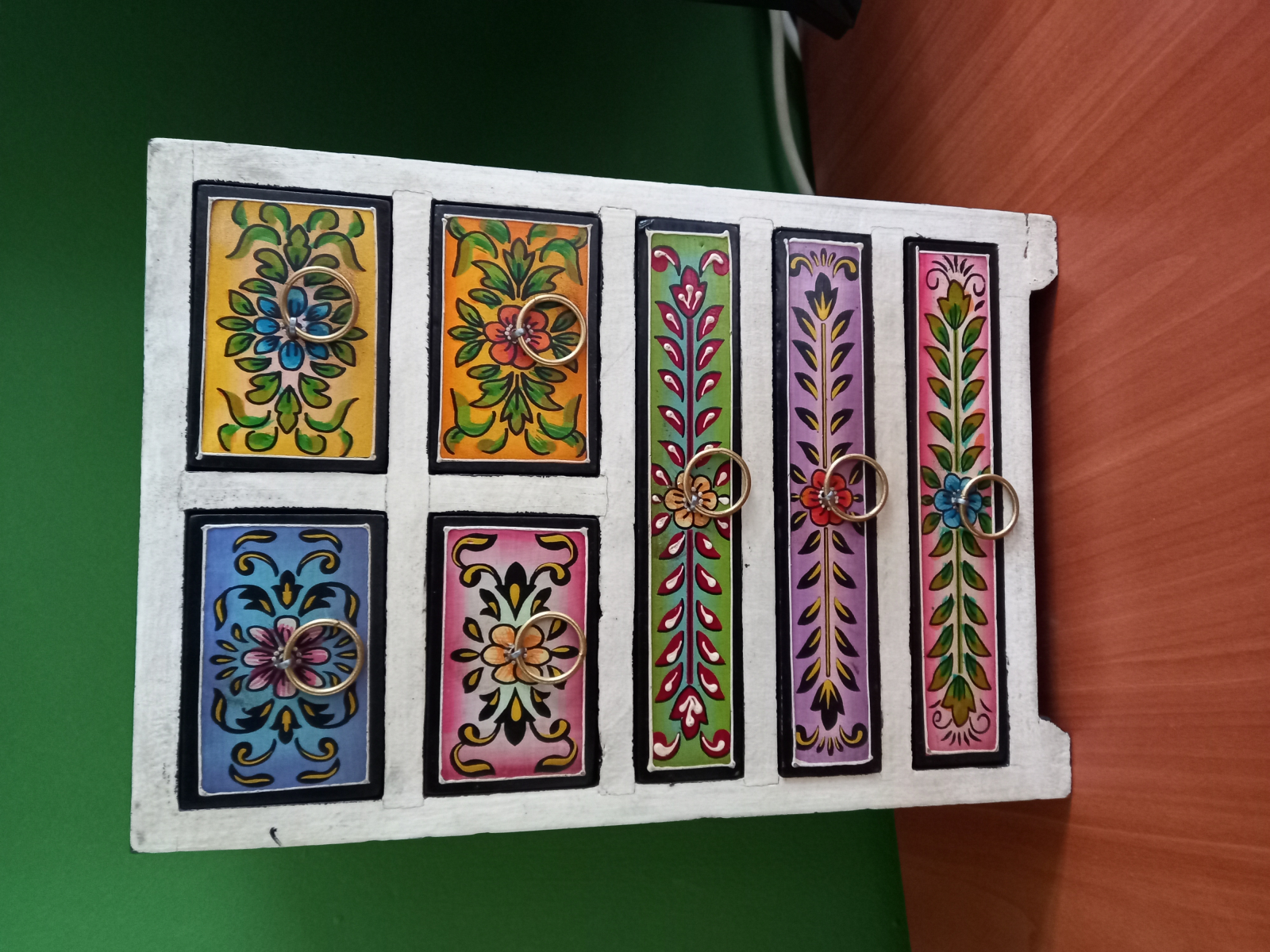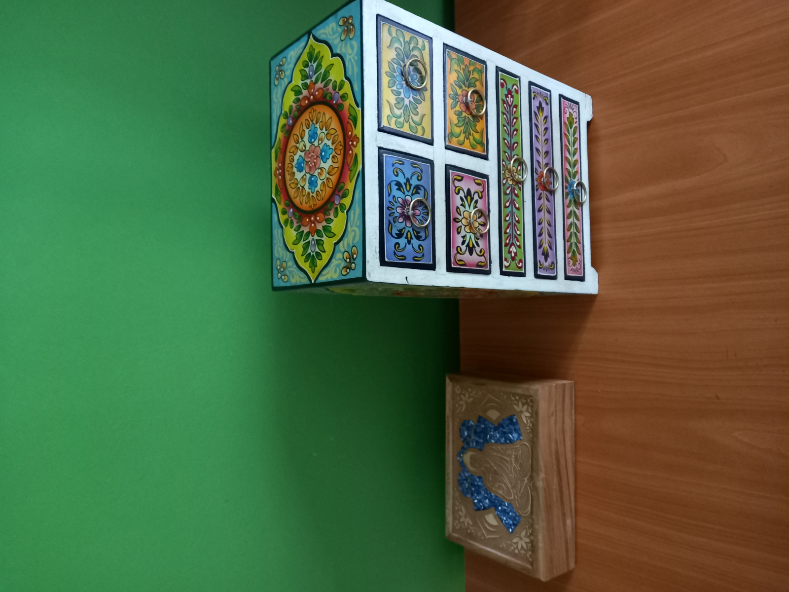 Este o piesa artizanala cu un aer vintage si eleganta atemporala. Realizat manual din lemn de mango sustenabil, dulapiorul are sapte sertare decorate individual cu motive florale si geometrice, pictate in nuante calde si bogate ce confera un aspect shabby chic distinctiv.