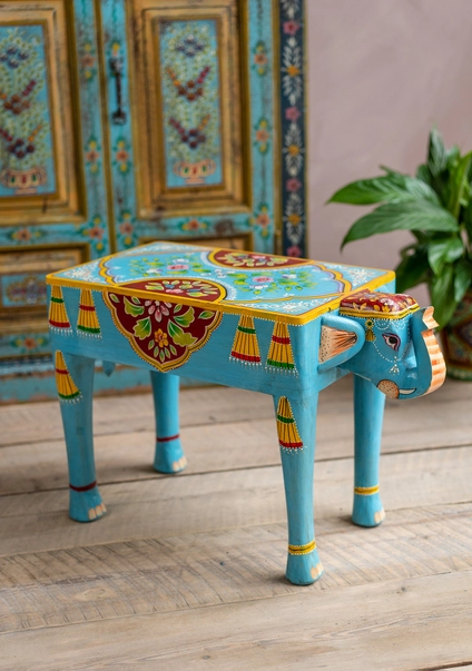 Masuta Gaja reprezinta un elefant sculptat cu trompa ridicata, simbol al norocului, pictat manual in detalii colorate si bogate. Aceasta piesa versatila poate fi folosita ca masuta laterala, suport pentru veioza, masuta ocazionala sau ca piedestal decorativ.