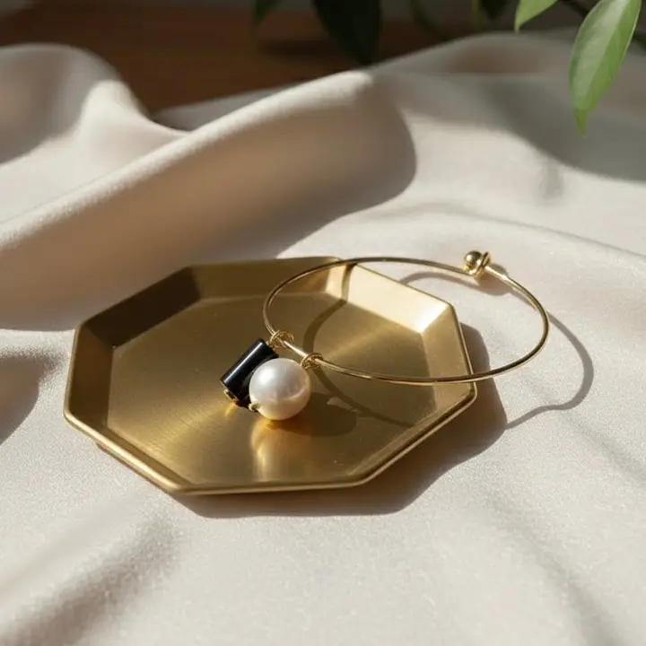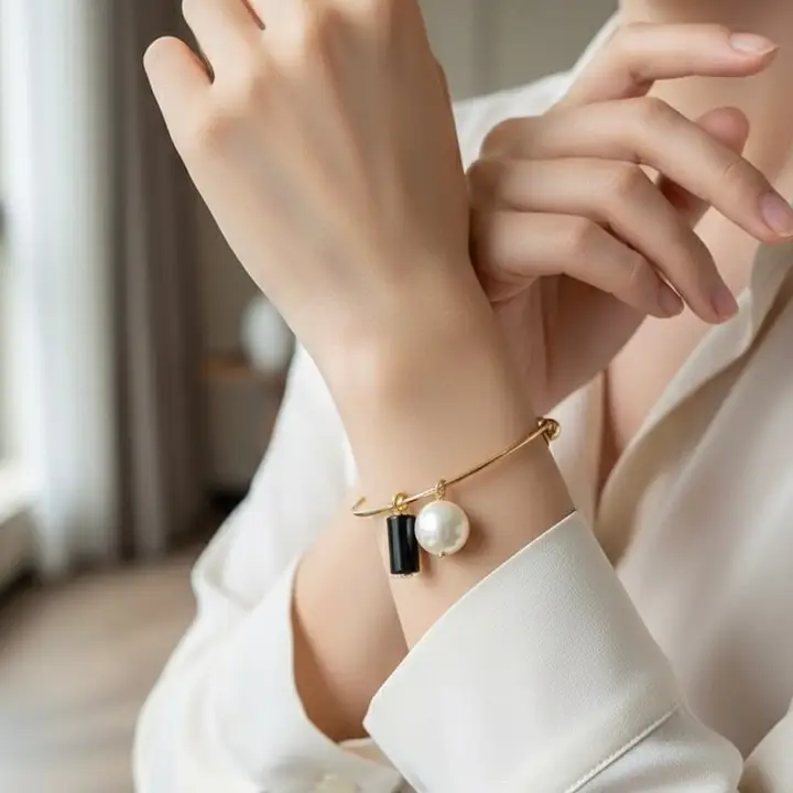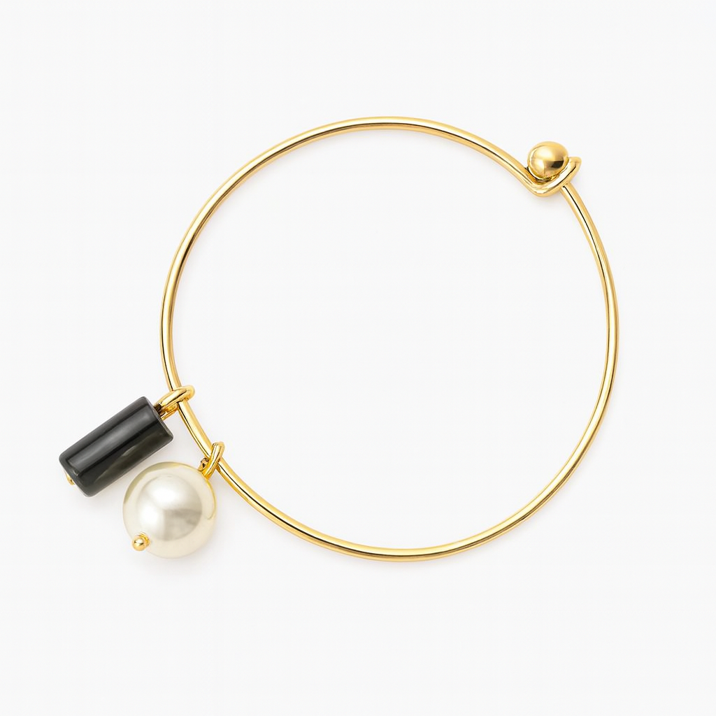 Onyx Radiance este o bratara rigida ce imbina eleganta clasica cu accente moderne, creand un accesoriu memorabil si rafinat. Realizata din otel inoxidabil placat cu aur 18K, bratara prezinta un joc vizual sofisticat intre nuantele aurii si elementele decorative suspendate: onixul negru lucios si perla Majorca.