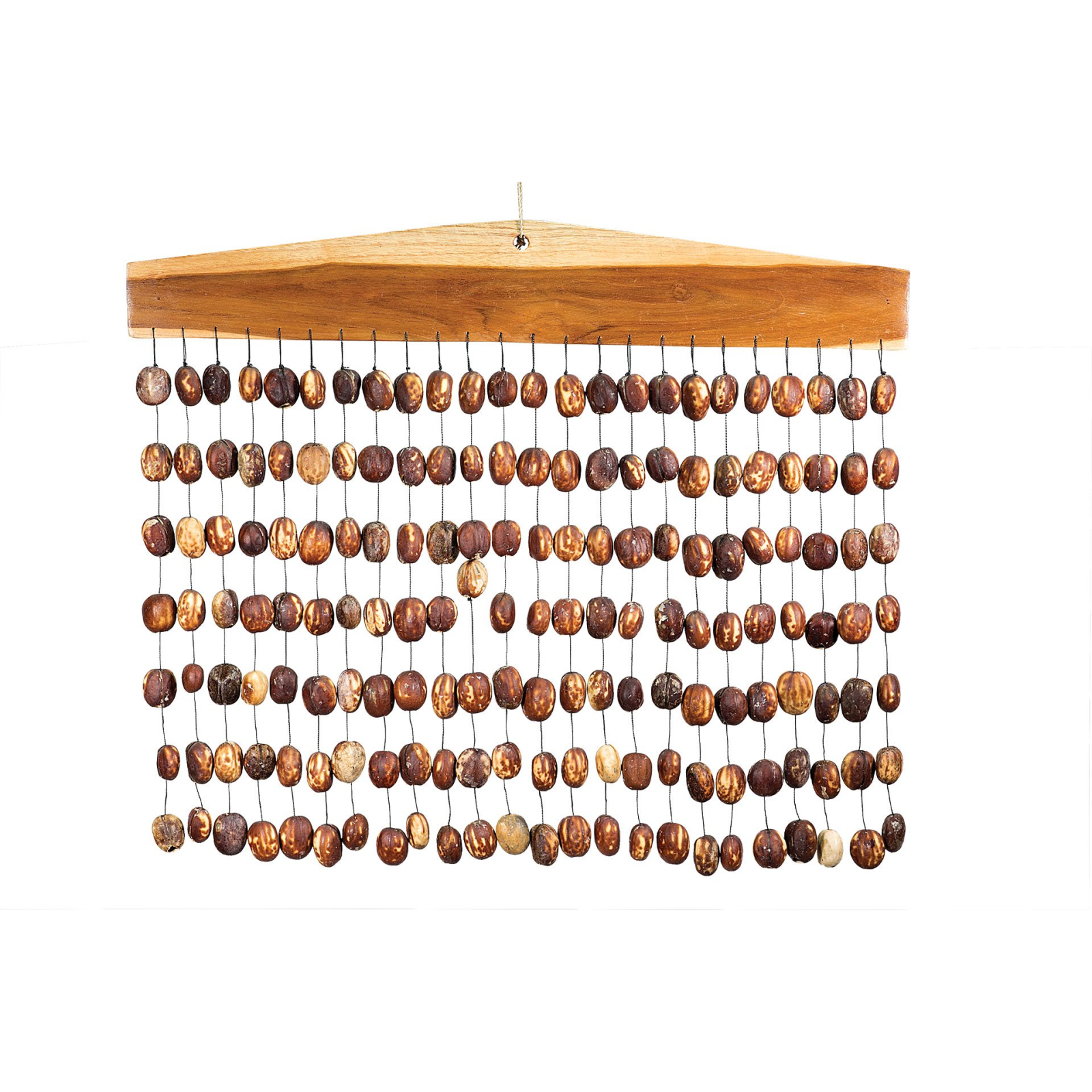 Bar Chime cu Nuci Pala este un instrument muzical decorativ si relaxant, apreciat pentru sunetul sau delicat si natural. Acest model este realizat din 24 de siruri, fiecare prevazut cu cate 7 nuci Pala atent fixate pe fire rezistente, montate pe o bara din lemn.
