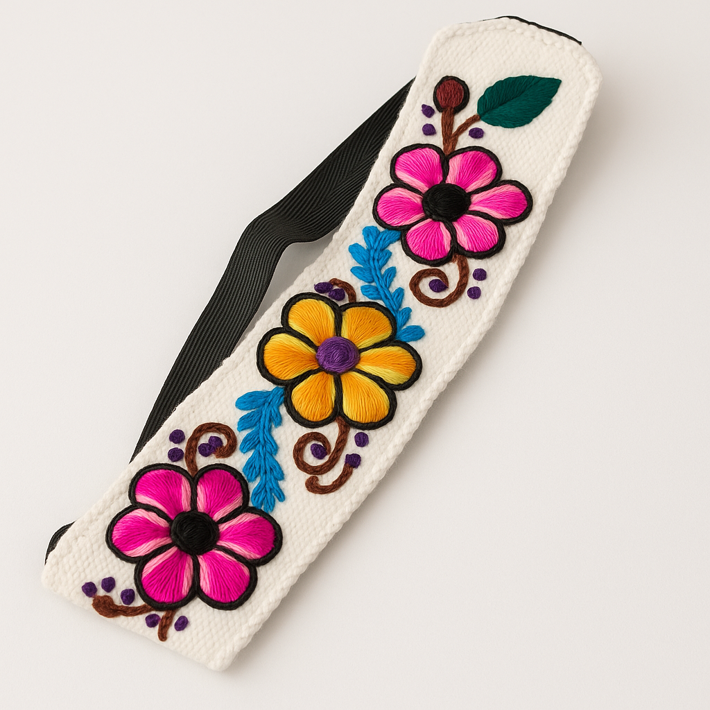 Aceasta bentita artizanala este realizata manual in regiunea Huancavelica, Peru, fiind brodata cu modele florale viu colorate, specifice traditiei andine. Fiecare piesa este unica, cu modele si combinatii cromatice distincte, ceea ce o face un accesoriu special pentru orice ocazie.