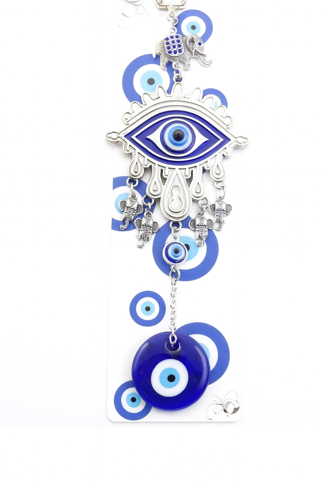 Amuleta decorativa realizata din metal si sticla, cu Ochi Turcesc (Evil Eye) si motive cu elefanti, un simbol universal folosit pentru protectie, noroc si echilibru energetico-spiritual. Este un obiect esoteric potrivit pentru casa, birou, intrare sau masina, creat pentru a respinge energiile negative si pentru a intensifica armonia spatiului.