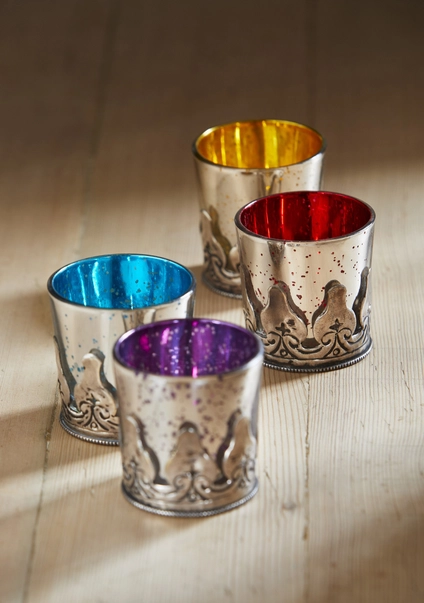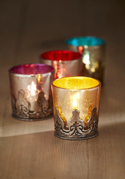 Un suport indian pentru lumanari tealight, realizat din sticla cu efect crackle, disponibil in variante de culoare: chihlimbar, rosu, mov si turcoaz. Este asezat intr-un suport argintiu, decorat cu motive spiralate, confectionat manual din fier reciclat.